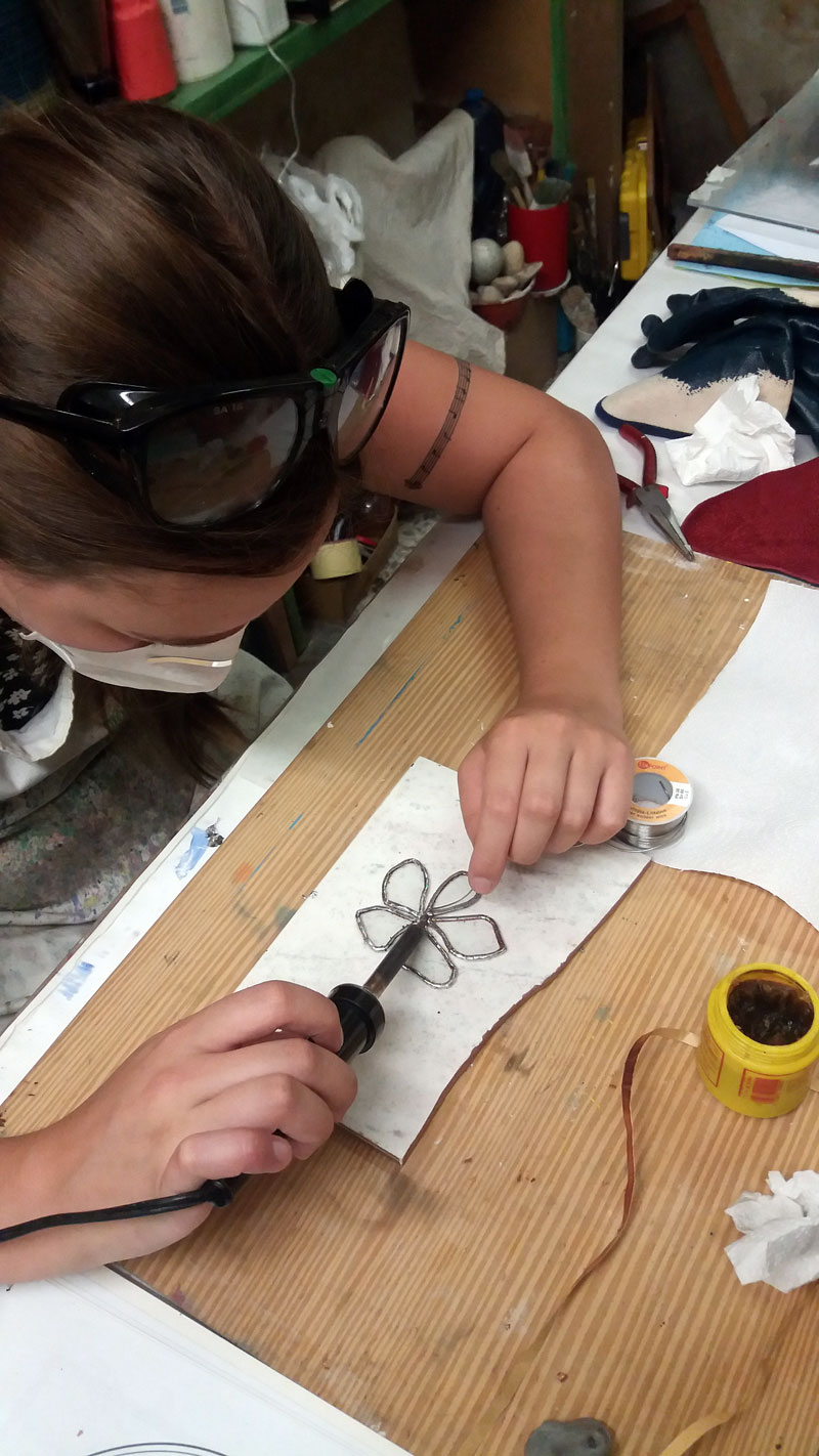 Uso di materiali come fili di rame adesivo, stagno, "acqua salda", colori per il vetro e materiali di decoro del vetro